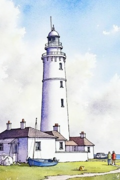 A watercolor painting of a white lighthouse on a cloudy day. The lighthouse is tall and white with a pointed roof. There are two people standing on the right side of the lighthouse. There is a small blue boat on the left side. The boat has a white sail on it and a black pole sticking out of the top of the boat. The building is a white house with a brown roof. The sky is a light blue with a few white clouds.