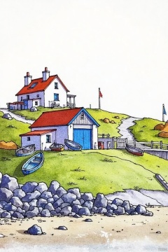A watercolor painting of a white house with a blue door and a red roof. The house is surrounded by a hill that has green grass on it. There is a row of gray rocks on the ground in front of the house. There are two boats on the grass. There's a wooden dock on the right side of the image.