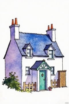 A watercolor painting of a two-story house with a blue roof and a green door. The house is painted in shades of blue, purple, and white. There are two chimneys on the roof of the house. There is a small wooden door on the right side of the blue house. A small wooden fence is in front of the green house.
