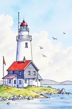 A watercolor painting of a white lighthouse with a red roof. The lighthouse is on a small island in front of a body of water. There is a flag on the left side of the lighthouse. There are birds flying in the sky above the lighthouse and a small house on the right side. The house is made of wood and has a white door on the front of it.