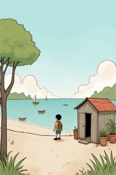 A cartoon drawing of a boy standing on a dirt path in front of a small wooden shack with a red roof. The boy is wearing a brown backpack, blue shorts, and black shoes. There is a tree on the left side of the image and a potted plant on the right. There are small boats in the water in the background. The sky is a light blue color and there are fluffy white clouds in the air.