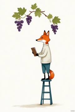 A cartoon drawing of a fox with a white long-sleeved shirt and blue pants. The fox is facing the left side of the image, with its head turned towards the right side. Its ears are pointed up, and its eyes are wide open. It is standing on a white surface, with a blue stool in front of it, holding a brown book in its right hand. Above the fox, there is a branch with purple grapes hanging from it.