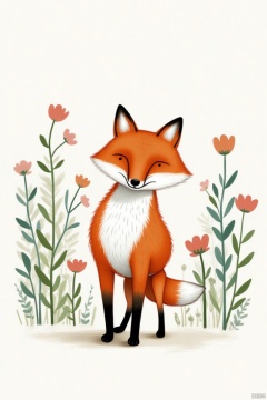 A medium-sized painting of a fox stands in front of a backdrop of flowers. The fox's fur is a vibrant orange, with a white chest and a black nose. Its ears are black, and the fox's tail is a lighter shade of orange. The background is a stark white, and there are green leaves and stems on either side of the fox, adding a touch of nature to the scene.