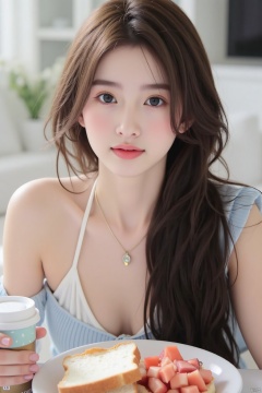 1girl, solo, long hair, looking at viewer, brown hair, jewelry, food, necklace, realistic,