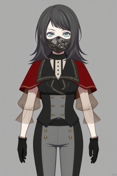 thigh boots,boots,black gloves,black footwear,see-through,pants,red capelet,thighhighs,black vest,long sleeves,buttons,shirt,black earring,black_mask,