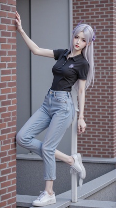 (1 girl: 1.3), solo singing. Medium chest circumference, (white hair: 1.4), (long legs: 1.3). Long hair, hair accessories. Looking at the audience, with bangs and purple eyes, she was wearing denim pants paired with black polo short sleeves. White casual shoes.