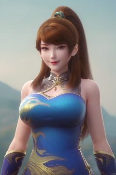1girl, solo, long hair, breasts, looking at viewer, smile, large breasts, brown hair, hair ornament, gloves, dress, bare shoulders, brown eyes, upper body, ponytail, lips, blue dress, chinese clothes, high ponytail, china dress,