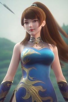 1girl, solo, long hair, looking at viewer, brown hair, dress, brown eyes, ponytail, weapon, chinese clothes, china dress,