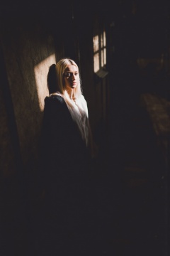 film grain,award winning photo,in the (dark:1.3),(deep shadow:1.3),creepy,scary,best quality,highres,ismail inceoglu,beautiful eyes,beautiful detailed face,1girl,beautiful woman,(white hair),(short hair),bob cut,((white leotard)),thighhighs,(large breasts),(narrow waist),wide hips,thick thighs,long legs,(detailed lips),(in a gothic castle),((moonlight)),light particles,intricate details,window in the background,dynamic angle,slight smile,(night:1.4),light master,