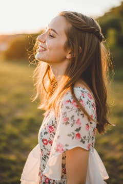 film grain,A candid film photograph of a girl with long brown hair in a loose braid, wearing a flowing summer dress. She is captured mid-laugh, looking away from the camera, her face and upper body bathed in the golden light of sunset. The outdoor setting and film grain create a dreamy, ethereal mood, reminiscent of classic film portraits. High quality, with an emphasis on natural beauty and emotion,light master,
