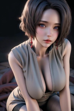 1girl solo breasts looking at viewer short hair blue eyes large breasts black hair thighhighs dress cleavage jewelry sitting earrings lips red lips