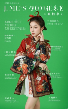 This is the cover of a high fashion magazine featuring a full body shot of a beautiful young Christmas girl dressed in a sophisticated Christmas outfit with a modern twist. Standing gracefully, she exudes confidence and elegance, her delicate features softly highlighted. Displaying intricate patterns, rich colors, and elegant details, the Christmas costume embodies a harmonious blend of traditional Japanese style and modern fashion. Her pose is dignified and poised, reflecting cultural elegance and modern sophistication. The background is a bright green color with magazine-quality professional lighting that enhances the realistic texture of her skin and the luxurious quality of her kimono. The cover displays striking and stylish magazine text horizontally, including the title in an elegant font: **"MERRY CHRISTMAS"** at the top. Other headlines include: - **"HUBG FLUX.1: Celebrate Christmas"** - **"The Art of Grace: Secrets to Timeless Beauty"** - **"Cultural Icon: Youth in Traditional Splendor"** The overall composition combines high-end fashion photography with captivating headlines that frame the model’s pose, highlighting her beauty, elegance, and cultural heritage. The cover reflects a sophisticated fusion of traditional Japanese aesthetics and modern fashion, embodying the Christmas Poster\(hubg style)\ for an impactful and visually stunning cover.
