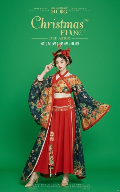 This is the cover of a high fashion magazine featuring a full body shot of a beautiful young Christmas girl dressed in a sophisticated Christmas outfit with a modern twist. Standing gracefully, she exudes confidence and elegance, her delicate features softly highlighted. Displaying intricate patterns, rich colors, and elegant details, the Christmas costume embodies a harmonious blend of traditional fashion and modern fashion. Her pose is dignified and poised, reflecting cultural elegance and modern sophistication. The background is a bright green color with magazine-quality professional lighting that enhances the realistic texture of her skin and the luxurious quality of her kimono. The cover displays striking and stylish magazine text horizontally, including the title in an elegant font: **"MERRY CHRISTMAS"** at the top. Other headlines include: - **"HUBG FLUX.1: Celebrate Christmas"** - **"The Art of Grace: Secrets to Timeless Beauty"** - **"Cultural Icon: Youth in Traditional Splendor"** The overall composition combines high-end fashion photography with captivating headlines that frame the model’s pose, highlighting her beauty, elegance, and cultural heritage. The cover reflects a sophisticated fusion of traditional fashion and modern fashion, embodying the Christmas Poster\(hubg style)\ for an impactful and visually stunning cover.