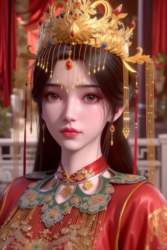 a close-up shot of a Chinese woman's head is adorned with a gold crown adorned with red and blue stones. Her eyes are a piercing blue, her hair is a dark brown, and she's wearing a red and green dress adorned with gold embroidery and a red choker around her neck. Her dress is adorned in a vibrant red, green and gold pattern, and her hair cascades down to her shoulders. She is wearing a pair of gold earrings, adding a touch of contrast to her outfit. The backdrop is blurred, with a red curtain and a white railing visible in the background.