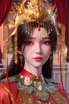 Close-up shot of a regal Chinese woman's face, adorned with a resplendent gold crown featuring vibrant red and blue stones. Her piercing blue eyes sparkle beneath a dark brown mane that cascades down her shoulders. She wears a stunning red and green dress embroidered with golden threads, complemented by a red choker around her neck. A pair of gleaming gold earrings add a touch of elegance to her ensemble. The blurred backdrop features a crimson curtain and white railing, subtly framing the subject's majesty.