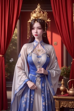 a woman dressed in a traditional Asian dress, adorned with a crown on her head, stands in front of a backdrop of red drapes. The woman's dress is adorned with white flowers and blue accents, adding a touch of color to the scene. To the right of the woman, a small teapot is placed on a brown table, adding to the overall ambiance.