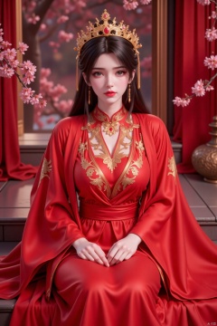 a woman dressed in a red silk dress, adorned with a gold crown, is seated on a step in front of a window. The woman's dress is adorned with gold accents, adding a touch of sparkle to her outfit. Her hair is styled in a sleek bob, and her eyes are a piercing blue. The backdrop is a vibrant red, with cherry blossoms adding a pop of color to the scene.