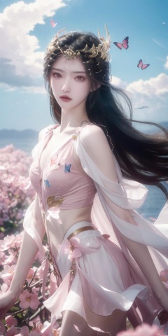side lighting,lustrous skin,(shine),(shiny skin, cetlic elements, norse heritage),ray tracing,wind swept hair,detailed hair,detailed face,depth_of_field,very detailed background,extreme light and shadow,(detailed eyes),perfect anatomy,,dynamic angle,1girl,((sea of pink flowers,with butterflies everywhere.,fluttering butterflies in the sky,colorful auspicious clouds,)),