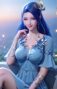 1girl, solo, long hair, breasts, looking at viewer, smile, blue eyes, hair ornament, dress, jewelry, sitting, blue hair, upper body, earrings, blue dress,