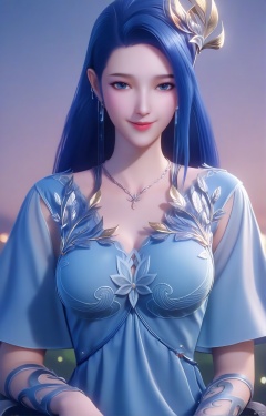 1girl, solo, long hair, breasts, looking at viewer, smile, blue eyes, hair ornament, dress, jewelry, sitting, blue hair, upper body, earrings, blue dress,
