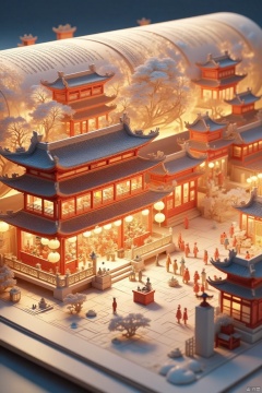 On one page of a book, a close-up of an ancient Chinese building can be seen depicting this Chinese New Year image, where the building is hung with lanterns and many Chinese characters are setting off firecrackers, visiting their families, interacting, and so on. The building is decorated with intricate carvings that add a touch of beauty to the image. The background is a soft blue color that contrasts with the architecture of the buildings.