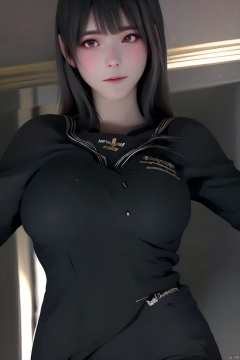 1girl solo long hair smile bangs skirt black hair long sleeves brown eyes jewelry closed mouth school uniform earrings serafuku indoors black skirt sailor collar arms up lips looking to the side black shirt arms behind head realistic