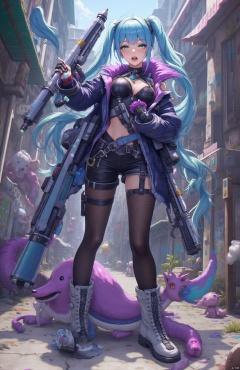 Jinx is wearing an asymmetrical leather top with a dark blue upper body and purple details on the edge, showing a punk style. She is wearing tight black shorts on her lower body, paired with various metallic decorations and bright-colored props. Her legs are covered in black stockings and high boots with metal rivets.
