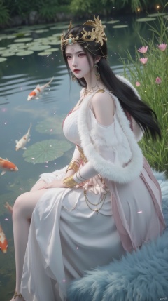 masterpiece,best quality,high quality,loli,1girl, koi, long hair, solo, hair ornament, fish, black hair, sitting, dress, double bun, chinese clothes, hair bun, looking back, long sleeves, hanfu, water, jewelry, pond, lotus, shawl, light particles, ripples, looking at viewer, white dress, necklace, leaf, closed mouth, flower, hagoromo, fireflies, twintails, ribbon, goldfish, grass