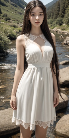 (extremely detailed:1.4),(realistic:1.4),1girl,(long hair:1.4),see-through white dress,lace,suburbs,mountain stream,outdoors,