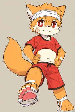 solo,male_child,shota.BREAK,,[bandage on left foot], (red t-clothes),(shorts),BREAK, (prefect_feets,prefect_hands,prefect_eyes:1.05), wide-angle,[looking at viewer], simple background, (hand on own hip),leg up,soles focus,BREAK, score_9,score_8_up,score_7_up,score_6_up,score_5_up,body fur,anthro,furry