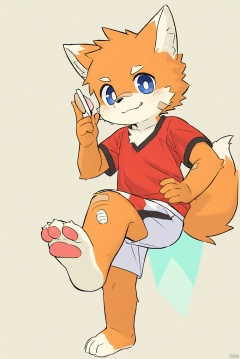 solo,male_child,shota.BREAK,,[bandage on left foot], (red t-clothes),(shorts),BREAK, (prefect_feets,prefect_hands,prefect_eyes:1.05), wide-angle,[looking at viewer], simple background, (hand on own hip),leg up,soles focus,BREAK, score_9,score_8_up,score_7_up,score_6_up,score_5_up,body fur,anthro,furry
