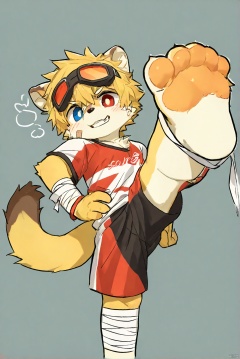 solo,male_child,shota.BREAK,,[bandage on left foot], (red t-clothes),(shorts),BREAK, (prefect_feets,prefect_hands,prefect_eyes:1.05), wide-angle,[looking at viewer], simple background, (hand on own hip),leg up,soles focus,BREAK, score_9,score_8_up,score_7_up,score_6_up,score_5_up,body fur,anthro,furry