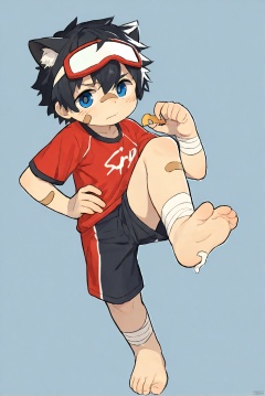 solo,male_child,shota.BREAK,,[bandage on left foot], (red t-clothes),(shorts),BREAK, (prefect_feets,prefect_hands,prefect_eyes:1.05), wide-angle,[looking at viewer], simple background, (hand on own hip),leg up,soles focus,BREAK, score_9,score_8_up,score_7_up,score_6_up,score_5_up,