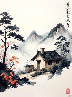 A Chinese ink wash landscape painting portrays a solitary cottage in the mountains. The cottage is surrounded by trees and flowers, creating a peaceful retreat. The ink strokes are simple yet expressive, capturing the essence of rural life and natural beauty.