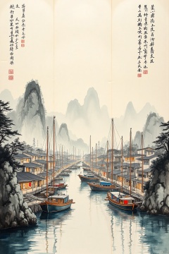 A panoramic ink wash painting of a Lingnan city situated on a coastal inlet. Fishing boats are moored along the waterfront, their sails furled. The city's distinctive architecture, with its integration of natural materials and its adaptation to the subtropical climate, blends seamlessly with the surrounding landscape. The artist should use a wide range of ink washes to create depth and atmospheric perspective, capturing the details of both the city and the coastal environment. Include details such as the texture of the water, the reflections on the water's surface, and the lush vegetation. The mood should evoke a sense of peace and prosperity.