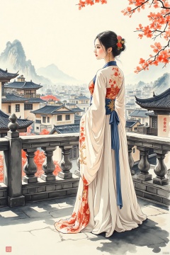 A beautiful woman in traditional Lingnan attire stands gracefully on a veranda overlooking a bustling city. The architecture of the buildings showcases the distinctive features of Lingnan style, with its low-rise structures and wide eaves providing shade. The woman's pose should be elegant and contemplative, her expression serene. The scene should evoke a sense of tranquility and cultural richness. The artist should use a variety of ink washes to create depth and contrast, emphasizing the textures of the clothing and the architecture. The brushstrokes should be both precise and expressive, capturing the details of the woman's clothing and the architecture while also conveying a sense of movement and serenity. The overall mood should be one of peaceful beauty and cultural harmony.
