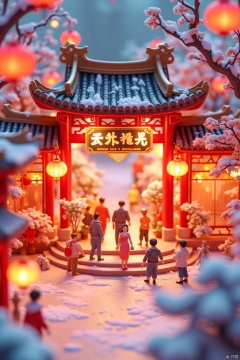 NYZG,Chinese architecture,Chinese character, Miniaturized,Spring Festival ,Ancient Chinese Architecture, Chinese New Year Figures, Lunar New Year Lanterns, Spring Festival Couplets, Gathering Outside, Lively Atmosphere, Temple of Words, Outstanding Lighting, Snow, Volumetric Landscape, 3D,super detail,