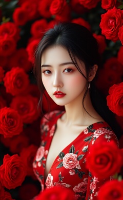 miluo_mggs, Photograph of an East Asian woman with fair skin, wearing a red floral dress amidst a sea of vibrant red roses. Her dark hair is styled loosely, framing her delicate, symmetrical face with red lipstick and subtle makeup. The image has a romantic, dreamy quality.<lora:米洛玫瑰故事-flux-1.3:1>