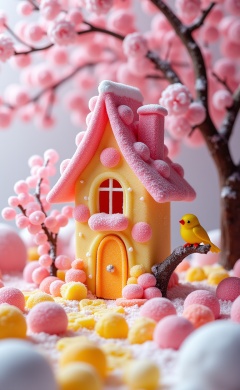 miluo_tgsj, This photograph captures a whimsical, sugar-coated cottage nestled amidst a snow-covered landscape. The cottage, constructed entirely from gummy candies in vibrant hues of pink, yellow, and orange, resembles a traditional fairy-tale house with a steeply pitched roof and a single, arched window. The roof and window frame are dusted with a light layer of sugar, giving them a frosty appearance. Surrounding the cottage are numerous colorful gummy candies in various shapes, creating a festive, candy-filled ground.To the right of the cottage, a small, bright yellow bird perches on a snow-dusted branch, adding a touch of life to the scene. The background features soft-focus, pink cherry blossom trees, which enhance the image’s enchanting and dreamy atmosphere. The overall color palette is pastel and soft, with a mix of pinks, yellows, and whites, evoking a sense of winter wonderland. The textures range from the smooth, glossy surfaces of the gummy candies to the powdery snow and the delicate, intricate branches of the cherry blossoms. The image is a delightful blend of fantasy and sweetness, making it a visually appealing and charming representation of a sugary, fairy-tale world.. <lora:miluo丨糖果世界-flux-1.3:1>