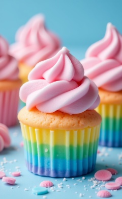 miluo_tgsj, Photograph of pastel-colored, rainbow-swirled cupcakes with fluffy, pink whipped cream tops on a blue, sprinkled surface; one cupcake in sharp focus, others blurred..<lora:miluo丨糖果世界-flux-1.3:1>