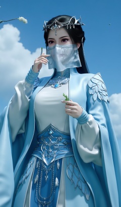 high detail,best quality,blue sky,(simple background:1.2),rim light,face the light,blight,shiny,(pale skin:1.3),day,white flower,branch,cloud,looking at viewer,large breasts,hands up, <lora:青禾-20:1> black hair, white face mask, covering her nose and mouth,blue gown with intricate silver trim and a high collar,