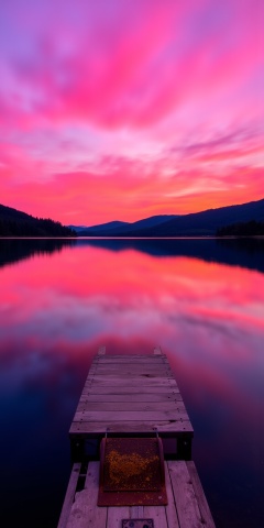 This photograph captures a serene lakeside scene at sunset,showcasing the tranquil beauty of nature. The image features a calm lake that reflects the vivid colors of the sky,creating a mirror-**** effect. The sky is ablaze with hues of pink,orange,and purple,creating a breathtaking gradient that stretches across the horizon. The water's surface is smooth,with minimal ripples,allowing the sky's colors to mirror perfectly.,In the foreground,a small,flat wooden dock extends into the lake,with a pair of rusty metal steps attached to it. The dock and steps are weathered,adding a touch of rustic charm. The steps are positioned towards the left side of the dock,pointing towards the middle of the lake.,The surrounding landscape features a dense,dark forest that forms the horizon,with the trees creating a silhouette against the vibrant sky. The forested hills in the background are slightly darker and less detailed,providing a natural frame for the scene.,The overall mood of the photograph is peaceful and contemplative,emphasizing the harmony between nature and human-**** elements. The colors,combined with the reflection,evoke a sense of tranquility and the fleeting beauty of the setting sun.,