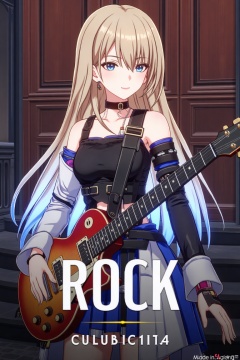 1girl, solo, long hair, holding electric guitar, ROCK text below, Made in Aglong subtitle at bottom.