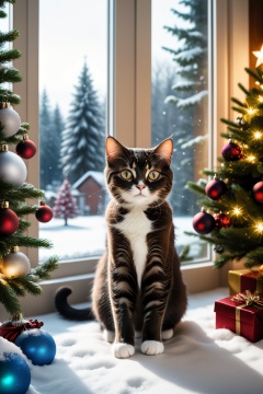 <lora:AgainChristmas_v1:0.6>, no humans, cat, snow, christmas tree, window, snowing, indoors, christmas ornaments