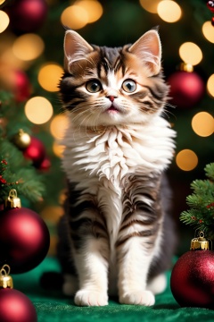 <lora:AgainChristmas_v1:1>, no humans, christmas tree, cat, blue eyes, whiskers, animal focus, blurry, animal, christmas, christmas ornaments, blurry background, solo, christmas lights, depth of field, looking at viewer, ornament, plant, closed mouth, bokeh