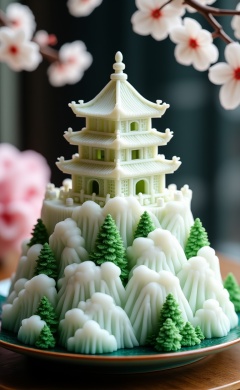 miluo_zsyd, Photograph of a detailed, white, multi-tiered pagoda cake adorned with green and white icing. Surrounding the pagoda are small, intricately designed trees and clouds made from white icing. The cake sits on a green ceramic plate. The background features a blurred, dark setting with hints of cherry blossoms, adding a serene, traditional Japanese aesthetic. The overall scene exudes a tranquil, festive atmosphere.<lora:米洛-中式盘中餐-flux-12.7:1>