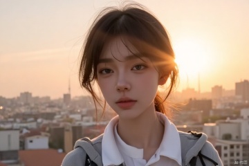 Photography, portrait, a slim Chinese women, short hair, standing on the top floor of a building,school uniform, backlight shooting, wind,sunset, shot with 300mm lens and f/2.0 aperture,bust, oval face,low topknot