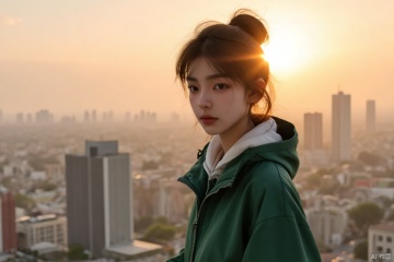 Photography, portrait, a slim Chinese women, short hair, standing on the top floor of a building, Green hardshell jacket, backlight shooting, wind,sunset, shot with 300mm lens and f/2.0 aperture,bust, oval face,low topknot,