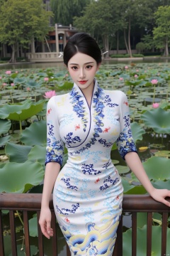 masterpiece,(best quality),official art, (1girl), (solo), ((looking_at_viewer)),(huge breasts:2.89),(full breasts:1.99),,(Forbidden City, osmanthus, lotus pond, lotus:1.3),Xnanhangqipao,Xhanfu,Xtanghanfu,Xzihanfu,Xqipao,Xzhanguopao