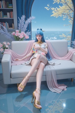 A serene 8K photo of a girl (GG) Lazily is sitting on top of a white couch. There are books on a shelf to the left of the woman. Part of a tree can be seen outside of the window. long hair, hair ornament, full body, flower, high heels, legs, bare legs, spread legs,cross legs.